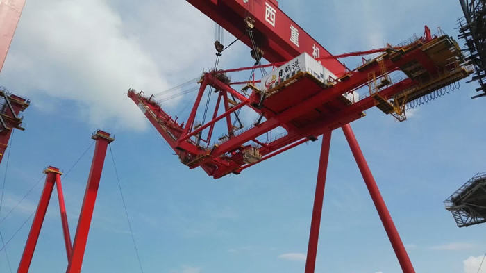 公司生產基地參觀同樣火爆:適逢總裝現場70T-60M岸邊集裝箱起重機項目整體吊裝, 1600T龍門吊平穩(wěn)吊起850噸的前后大梁、緩緩上升、精準定位、穩(wěn)穩(wěn)落于該岸橋的門框上,現場高效的安裝工藝,給了在場的400余嘉賓巨大的視覺沖擊,掌聲、贊美聲陣陣不斷。公司整體室內噴涂的涂裝工藝、超大型設備整機滾裝運輸的軟硬件實力也讓參觀嘉賓耳目一新。