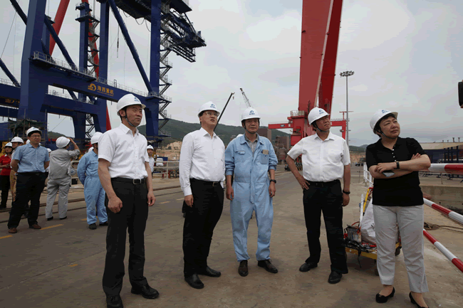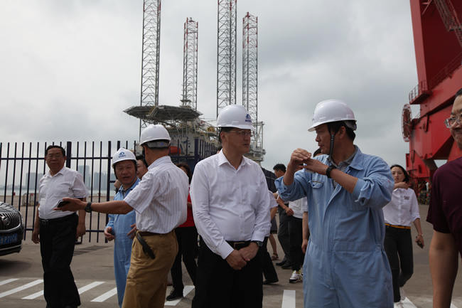 楊軍一行參觀了海西重機(jī)港口設(shè)備總裝現(xiàn)場,并重點參觀了在建的阿聯(lián)酋110米桁架自升式海工平臺,聽取了海西重機(jī)董事長鄧振山對公司目前生產(chǎn)經(jīng)營形勢、生產(chǎn)負(fù)荷情況等方面的介紹,對海西重機(jī)在國際海工平臺市場上所取得的成績給予了肯定。