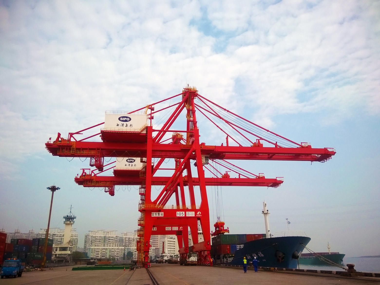 12月13日早5時(shí),G215項(xiàng)目的2臺(tái)舊機(jī)岸橋如期發(fā)運(yùn),上海的天氣也終于放晴,雨后的太陽(yáng)總是那么的耀眼。經(jīng)過(guò)雨水的洗禮,屹立在黃浦江邊的2臺(tái)新機(jī)岸橋在藍(lán)天白云的映襯下也顯得格外耀眼,那一抹鮮紅已然成為黃浦江風(fēng)景的一部分,那一抹鮮紅也成為了海西重機(jī)走進(jìn)上海港的名片。