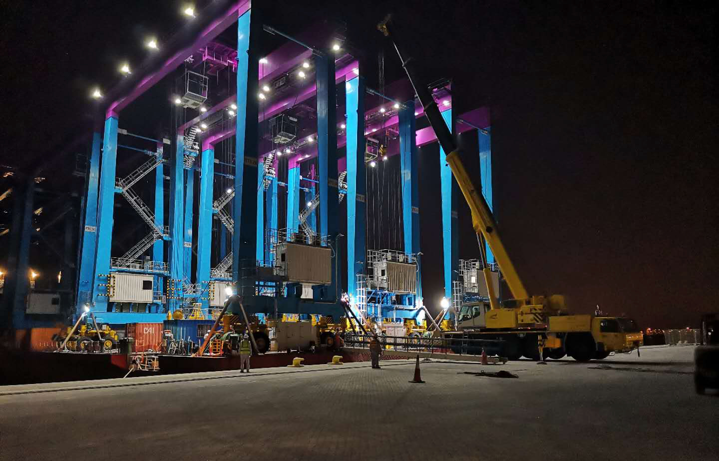 而在7月末發(fā)運(yùn)的第一批12臺(tái)40T輪胎吊經(jīng)過1個(gè)月的航行到港后,9月初順利完成卸船,擁入新哈馬德港的懷抱。由于業(yè)主方的高層對(duì)該項(xiàng)目高度重視,碼頭方有關(guān)人員還在碼頭舉行儀式迎接設(shè)備抵港并全程航拍錄像。因項(xiàng)目整體施工策劃得當(dāng)、安全高效,疫情防控和設(shè)備調(diào)試并駕齊驅(qū)兩不誤,“海西重機(jī)”再一次贏得了業(yè)主的稱贊。
