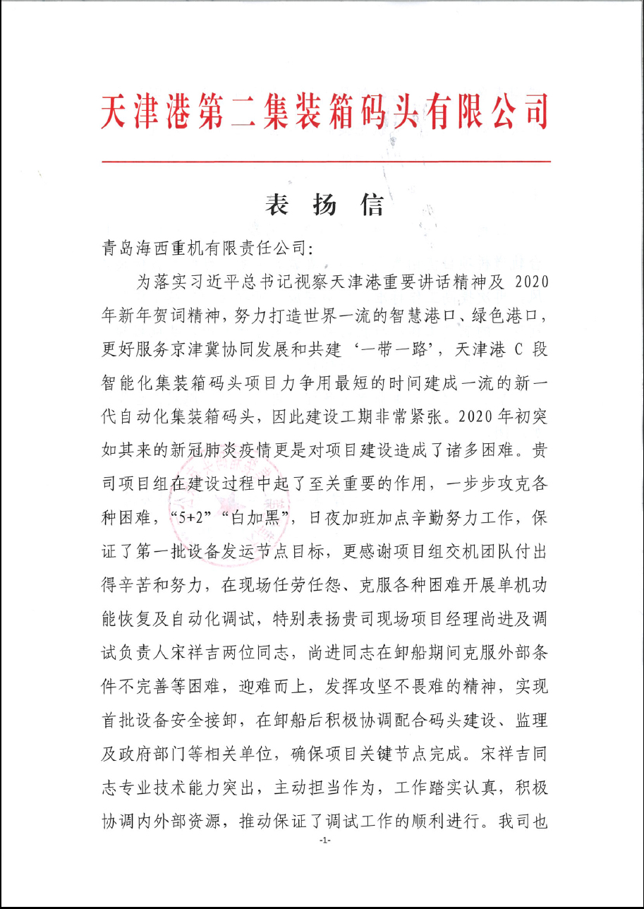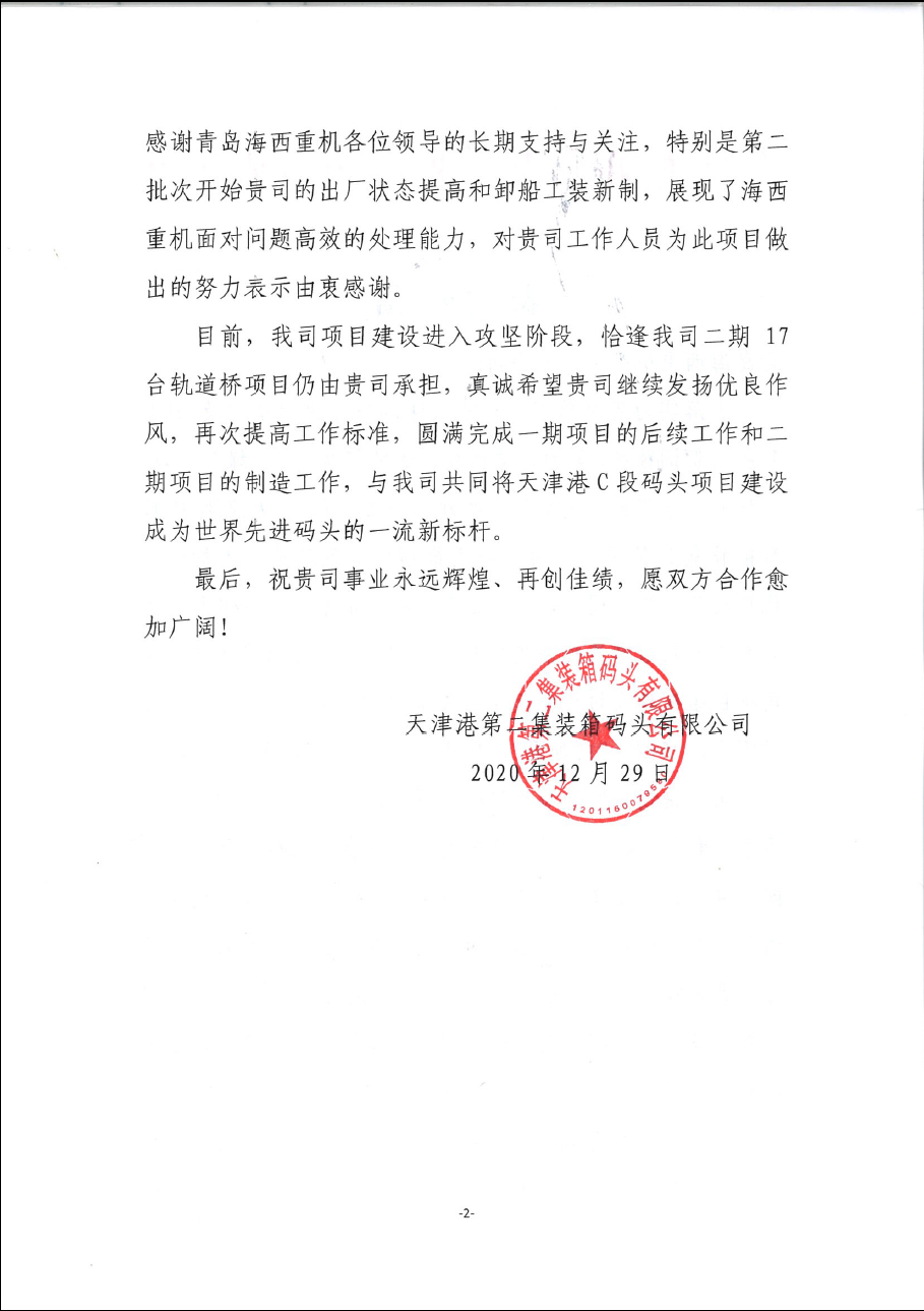表揚(yáng)信的最后,天津港業(yè)主也對海西重機(jī)領(lǐng)導(dǎo)班子對于此項目的關(guān)注與支持表達(dá)了特別感謝,對于海西重機(jī)承制的二期17臺軌道吊項目表達(dá)了高度信任和美好期許!