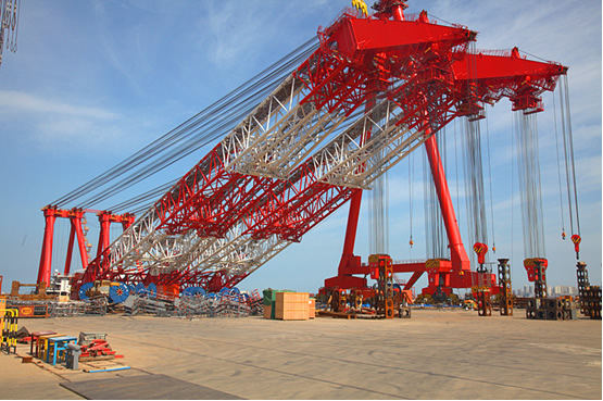第一次超特大件吊裝:臂架單重1300t、長(zhǎng)度140米,三個(gè)吊排共十六個(gè)吊點(diǎn)同時(shí)起吊,場(chǎng)面壯觀。
