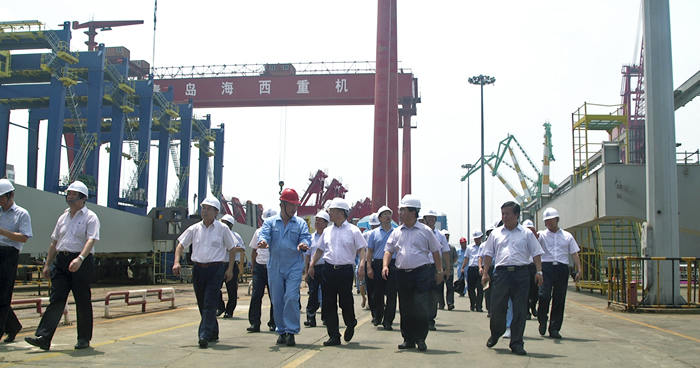 在海西重機(jī)總裝現(xiàn)場(chǎng),張德平副市長實(shí)地考察了待批量發(fā)往黎巴嫩的岸橋和輪胎吊項(xiàng)目、發(fā)往馬來西亞的帶斗門機(jī)項(xiàng)目、發(fā)韓國鮮光新港的軌道吊項(xiàng)目及承制、調(diào)試的功能性海工平臺(tái)項(xiàng)目等。并聽取了海西重機(jī)董事長孫國慶關(guān)于企業(yè)上半年經(jīng)濟(jì)運(yùn)行情況、轉(zhuǎn)型升級(jí)取得的成績以及在目前經(jīng)濟(jì)形勢(shì)下的合同承接情況。