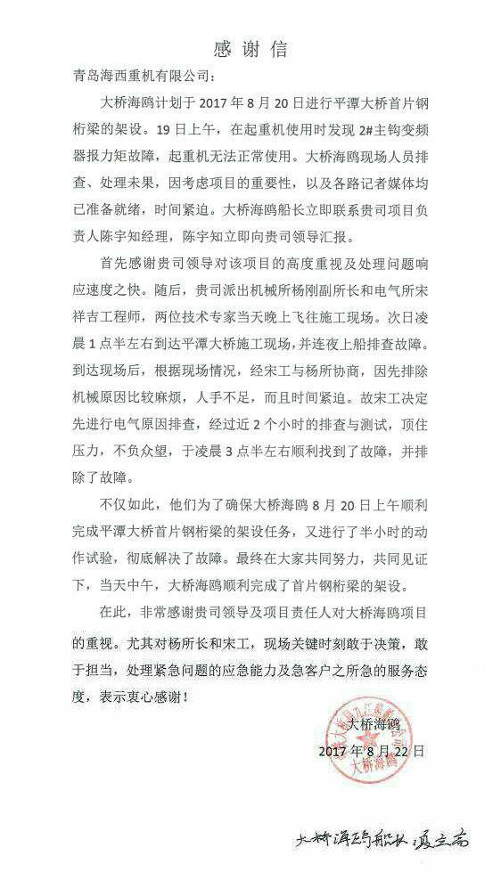 自今年年初設(shè)備交付以來,海西重機定期安排技術(shù)人員進行回訪,協(xié)助業(yè)主方對設(shè)備進行檢查和保養(yǎng),及時處理故障,保證設(shè)備高效運作,有力地保障了現(xiàn)場施工的可靠性和穩(wěn)定性,海西重機工作人員負責、用心的工作態(tài)度和完善的售后服務(wù)得到了業(yè)主方的一致好評,業(yè)主特發(fā)來感謝信給予表揚。