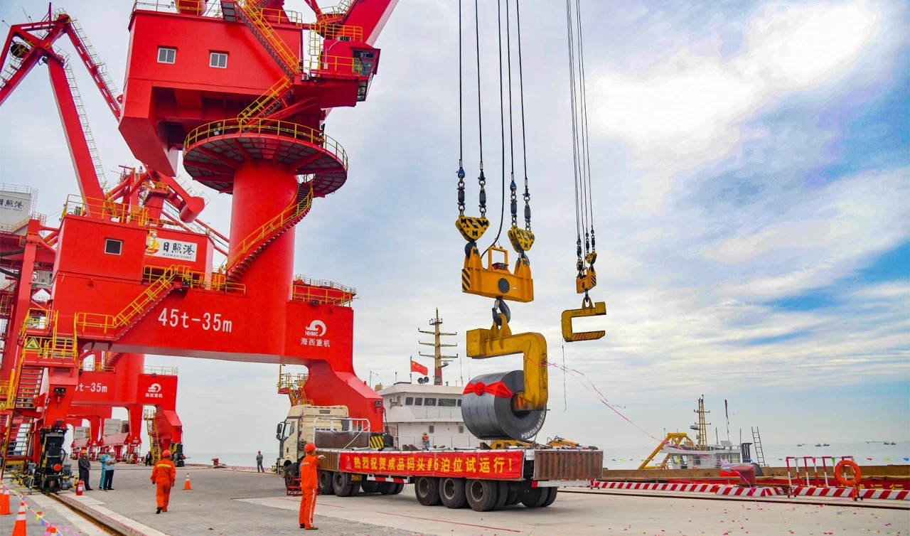 3臺(tái)門機(jī)應(yīng)用于用戶剛剛投產(chǎn)的6#泊位——日照鋼鐵精品基地配套成品碼頭工程泊位,泊位為4萬(wàn)噸級(jí)雜貨泊位,長(zhǎng)度265米,年設(shè)計(jì)通過(guò)能力120萬(wàn)噸。作為日照港山鋼碼頭有限公司成立以來(lái)建成的第一個(gè)泊位,將與山鋼集團(tuán)日照公司實(shí)現(xiàn)“前港后廠”一體化運(yùn)營(yíng),滿足成品及部分原料海路運(yùn)輸?shù)钠惹行枨?,為鋼鐵精品基地開辟最便捷、最經(jīng)濟(jì)的通道,推動(dòng)“鋼港”發(fā)展邁上新臺(tái)階。