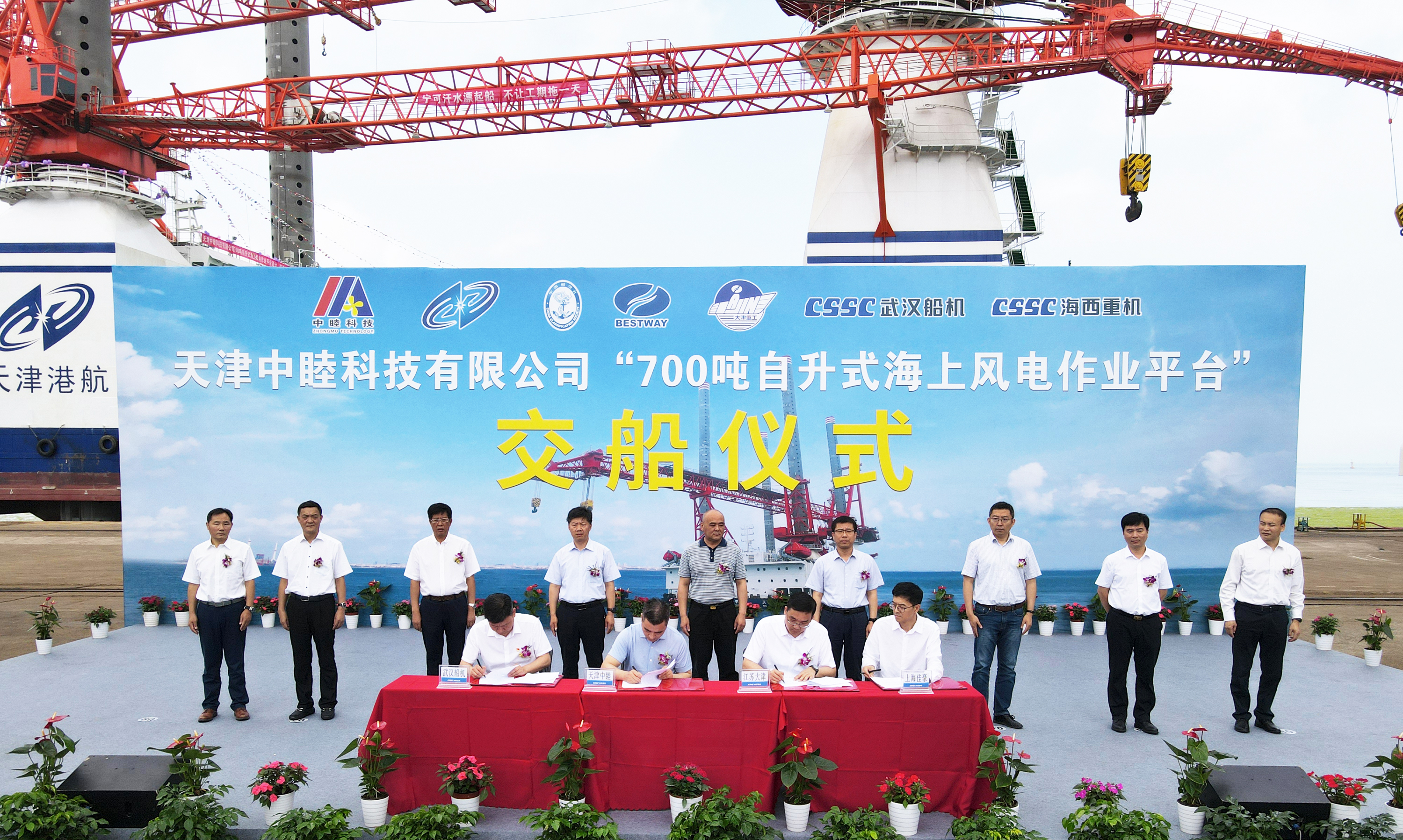 6月28日上午,天津中睦科技有限公司700T自升式海上風電作業(yè)平臺——“港航平7”在中國船舶集團旗下武漢船機海西重機順利交付。