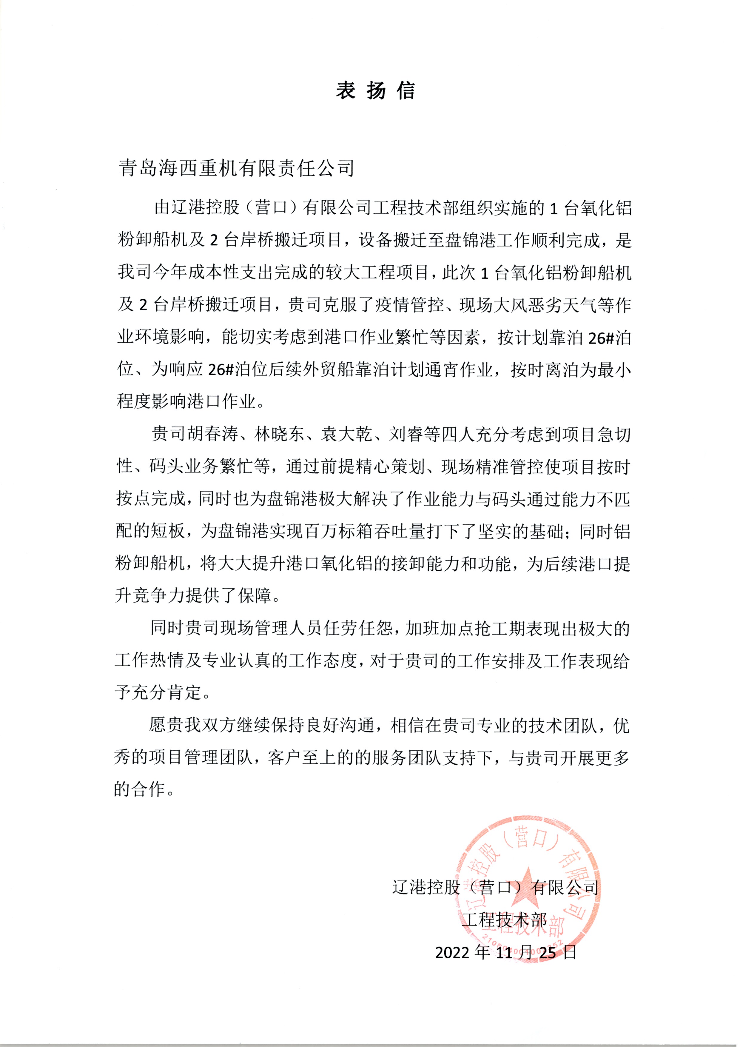 項目施工期間,正值當(dāng)?shù)匾咔榉揽鼐o張之時,經(jīng)過溝通協(xié)調(diào),在遼港控股、盤錦港集團的大力支持下,特批了綠色通道,提供港內(nèi)食宿。項目攻關(guān)小組所有人員均食宿在碼頭,克服大風(fēng)、寒潮等惡劣天氣以及疫情帶來的不利因素,經(jīng)過20多天的晝夜奮戰(zhàn),設(shè)備最終安全高效、保質(zhì)保量的交付客戶使用。專業(yè)的人干專業(yè)的事,整個項目搬遷工作得到了客戶的充分肯定和贊揚。