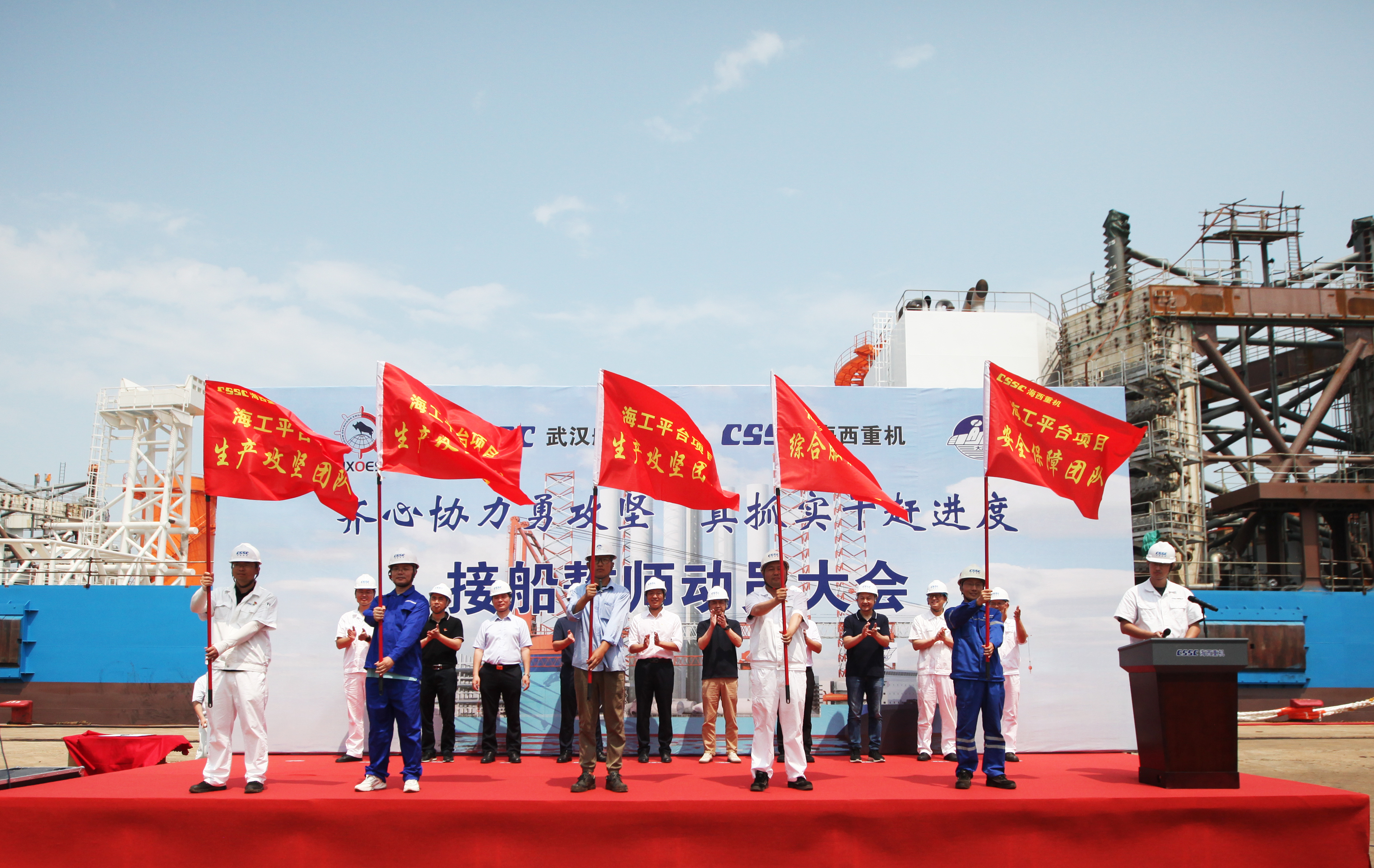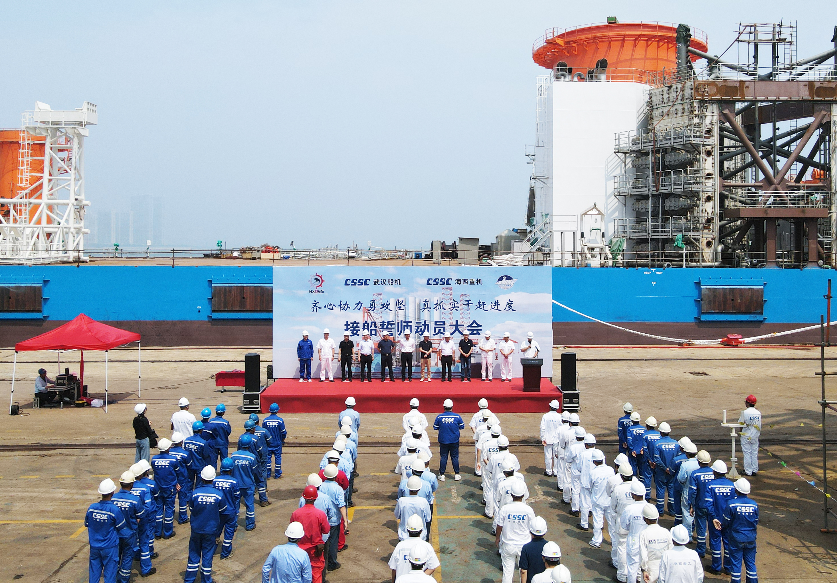 為了明確目標(biāo)、凝聚共識(shí)、齊心協(xié)力、克難攻堅(jiān),亮明迎難而上的堅(jiān)定信心和堅(jiān)強(qiáng)決心,動(dòng)員全員上下持續(xù)營(yíng)造濃厚干事氛圍,掀起“齊心協(xié)力勇攻堅(jiān),真抓實(shí)干趕進(jìn)度”的高潮,全力以赴打好海工項(xiàng)目集中攻堅(jiān)戰(zhàn),6月27日上午,武漢船機(jī)公司在海西重機(jī)碼頭生產(chǎn)現(xiàn)場(chǎng)組織開(kāi)展華西海工1600T風(fēng)電安裝平臺(tái)接船誓師動(dòng)員大會(huì)。江蘇華西村海洋工程服務(wù)有限公司董事長(zhǎng)高明、總經(jīng)理吳文勝,武漢船機(jī)黨委書記、董事長(zhǎng)馬聚勇,副總經(jīng)理孫凱,海西重機(jī)黨委書記、董事長(zhǎng)李儒新等出席動(dòng)員大會(huì)。江蘇大津重工有限公司總經(jīng)理王友軍、大連船舶重工集團(tuán)裝備制造有限公司項(xiàng)目經(jīng)理韓濤等相關(guān)領(lǐng)導(dǎo)參加了本次動(dòng)員大會(huì)。