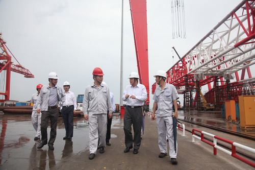 在參觀公司現(xiàn)場建成自用的1600噸龍門吊項目、正在吊裝上船的3600噸全回轉浮吊項目、面對公司的120米突堤碼頭以及繁忙的生產(chǎn)組裝現(xiàn)場,董總對公司的經(jīng)營發(fā)展態(tài)勢予以充分肯定。他說:在當前市場經(jīng)濟低迷的形勢下,青島海西重機能夠抓住發(fā)展機遇,逆勢而上,尤其在技術創(chuàng)新和產(chǎn)品開發(fā)方面發(fā)揮了自身潛能,具有前瞻性和市場眼光,更是武漢船機公司在船市低迷的情況下,產(chǎn)品結構調整的有力體現(xiàn)。董總特別對近期在煙臺、連云港、海南洋浦等港口項目投標中,我司與上海振華同臺競標并連續(xù)奪得標的給予了高度肯定。