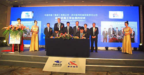 2014年7月2日,武漢船用機械有限責任公司與東方華晨集團,在青島海西灣青島海西重機舉行了10臺自升式海工平臺項目的合同簽字儀式。武漢船機董事長何紀武、東方華晨集團主席程立新先生等出席了簽字儀式。